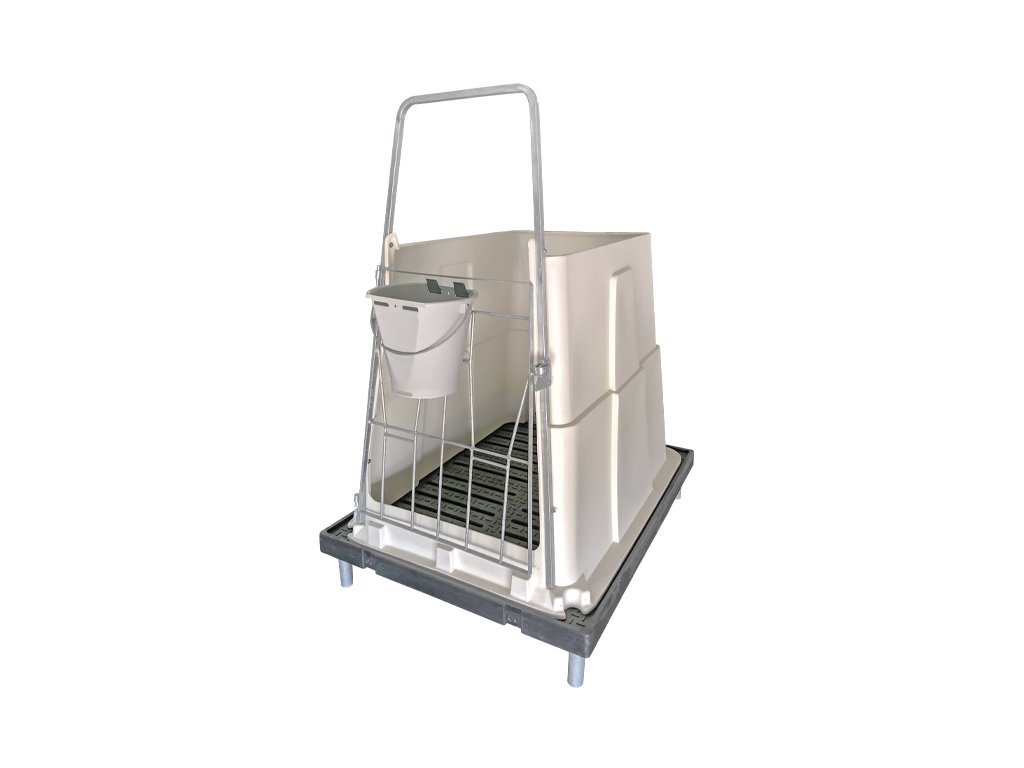 Kotec je vybaven integrovanou roštovou podlahou, která je zvednutá nad zem pomocí pozinkovaných kovových nohou. Toto provedení zajišťuje optimální odvod tekutin a suché prostředí pro telata. Pro snadné čištění je kotec opatřen vyklápěcím systémem, který umožňuje překlopení kotce a snadné očištění podlážky i stěn.